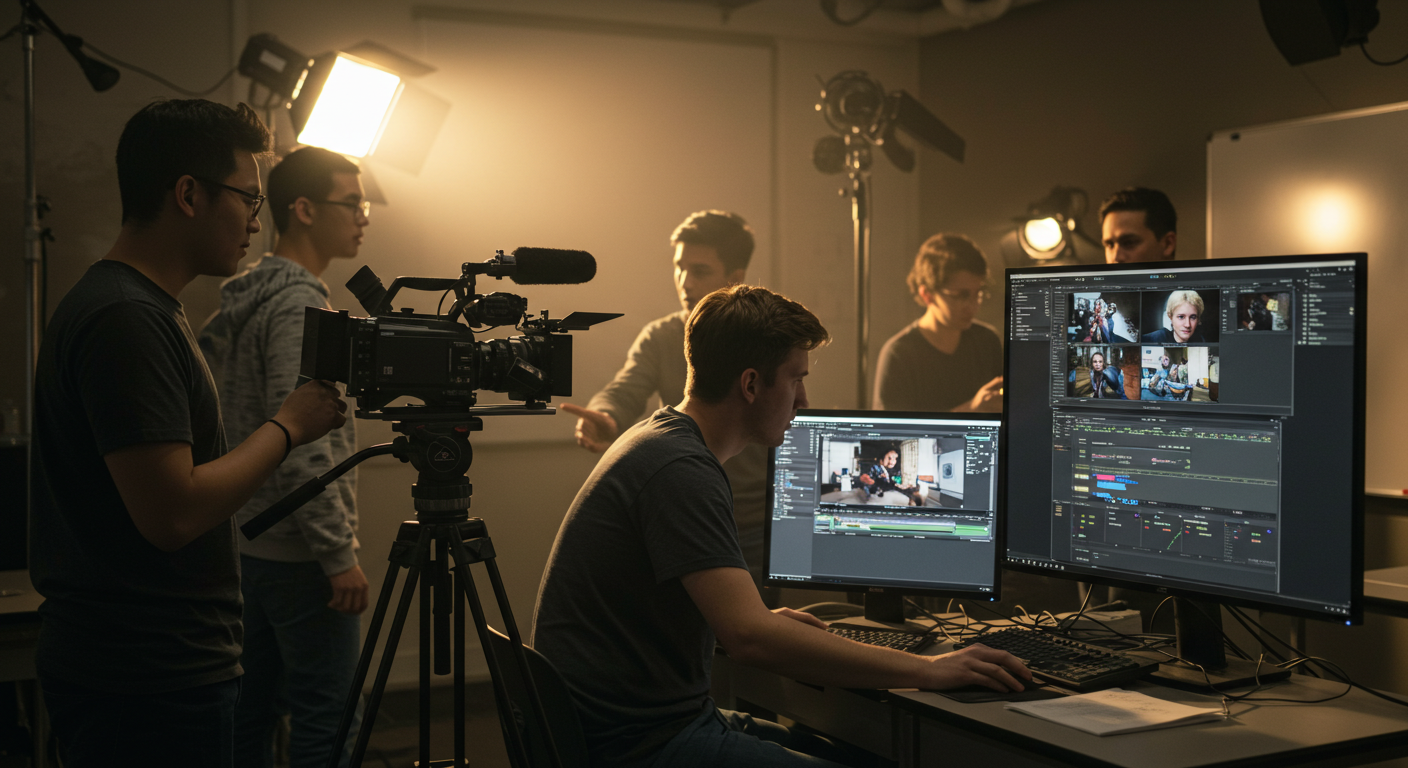 영상제작학과는 이론 수업만큼이나 팀 프로젝트가 정말 중요해요. 혼자서는 절대 영화 한 편을 만들 수 없으니까요. 동기들과 함께 머리를 맞대고 기획부터 촬영, 편집까지 모든 과정을 경험하게 됩니다.